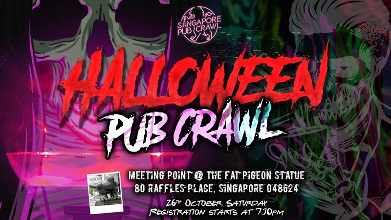 The Halloween Pub Crawl starts at 7.30pm and crawlers will meet at the Fat Pigeon Statue at 80 Raffles Place (Raffles Place MRT, Exit G).