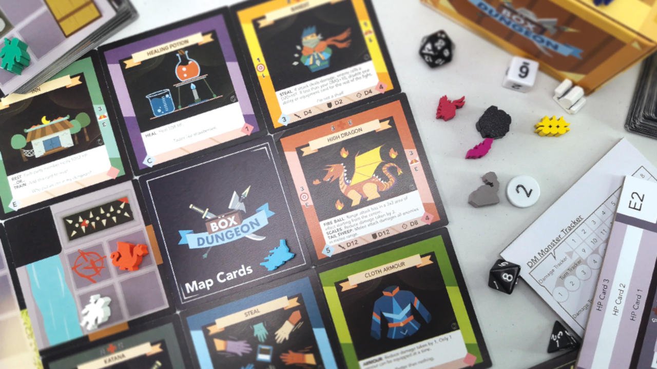 Consisting map tiles, loot and encounter cards, monster meeples, 2 sets of dice, and even a DM screen, Box Dungeon succinctly contains everything you’d need for your own Dungeons & Dragons-esque game lite.