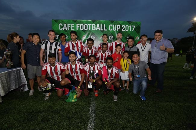 Gary Neville and Ryan Giggs with the winning team of the CF Cup Grand Final, Kalan Associates.